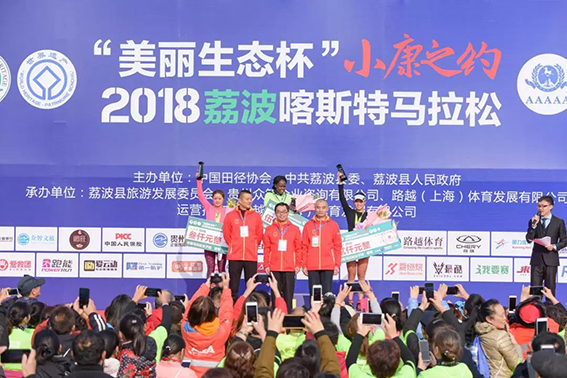 亚星会员平台公司代表及荔波县领导为半马男子组前三名颁奖