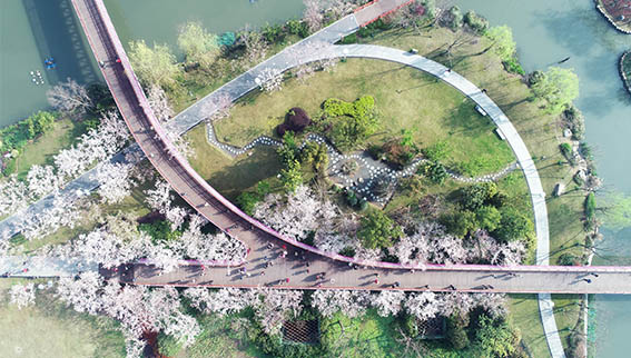 通过对场地的整体改造提升,从景观天桥的构造、滨水岸线的细致处理、地铁上部构筑物的美化利用、亲水步道、汀步以及亲水平台等共同营造了公园的赏樱五式:“路沿扶樱”、“眺水观樱”、“依木赏樱”、“揽桥闻樱”、“夜畔听樱”,带给游人多重赏樱体验,感受桥下浅深水,两间红白花的美景。