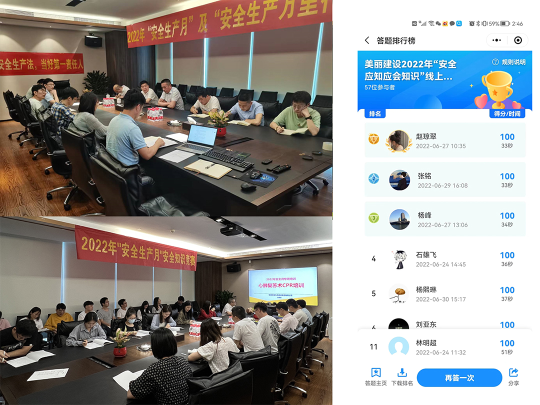 公司本部举行“安全生产月”启动仪式,组织员工学习安全生产月活动方案,观看安全生产月主题宣传片,进行安全承诺签名、心脏复苏术急救培训、线上线下安全知识竞答等活动。通过一系列安全活动传播了安全生产知识,提升了全员自我保护意识和安全防范能力,进一步推动公司安全文化建设,提高公司安全管理水平。
