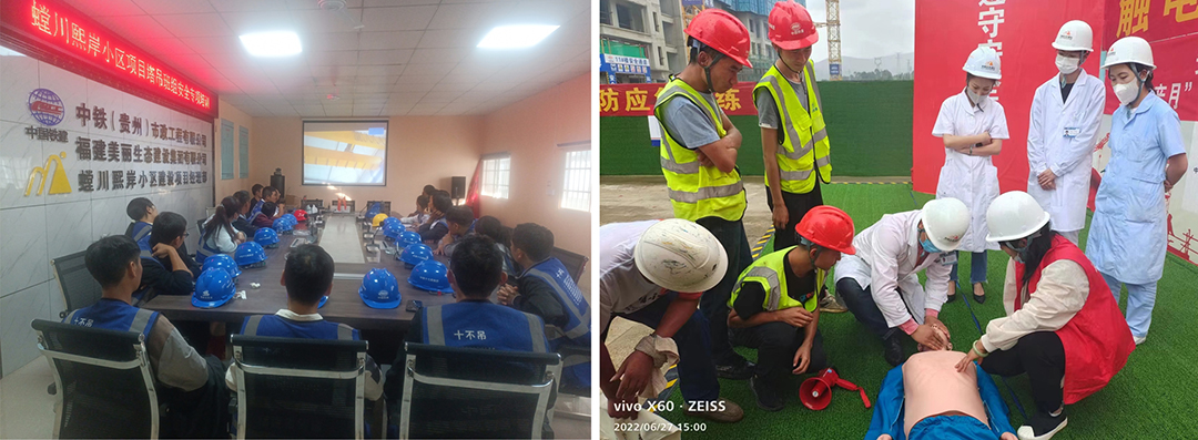 安宁螳川熙岸项目部围绕“安全生产月”活动主题,组织员工观看安全生产月主题宣传教育片,联合当地社区共同开展消防、触电、高处坠落综合应急演练,开展安全自查自纠、发放安全知识宣传手册、进行安全宣誓和主题签名等活动,通过“安全生产月”系列活动有效提高了员工安全意识,丰富了员工应急救护知识,提高了项目安全管理水平。